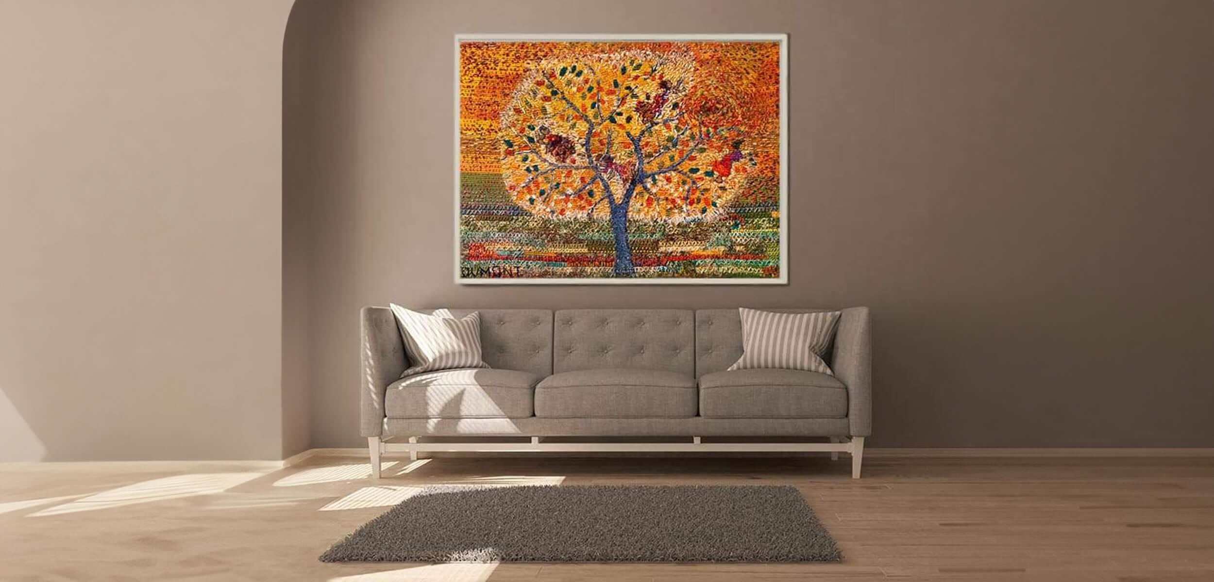 As obras de arte do Matizes Dumont são bordadas em diferentes tamanhos e materiais. São feitas de forma interativa pela mãe, quatro filhas e o filho, vivencia e cria obordado livre e espontâneo.
