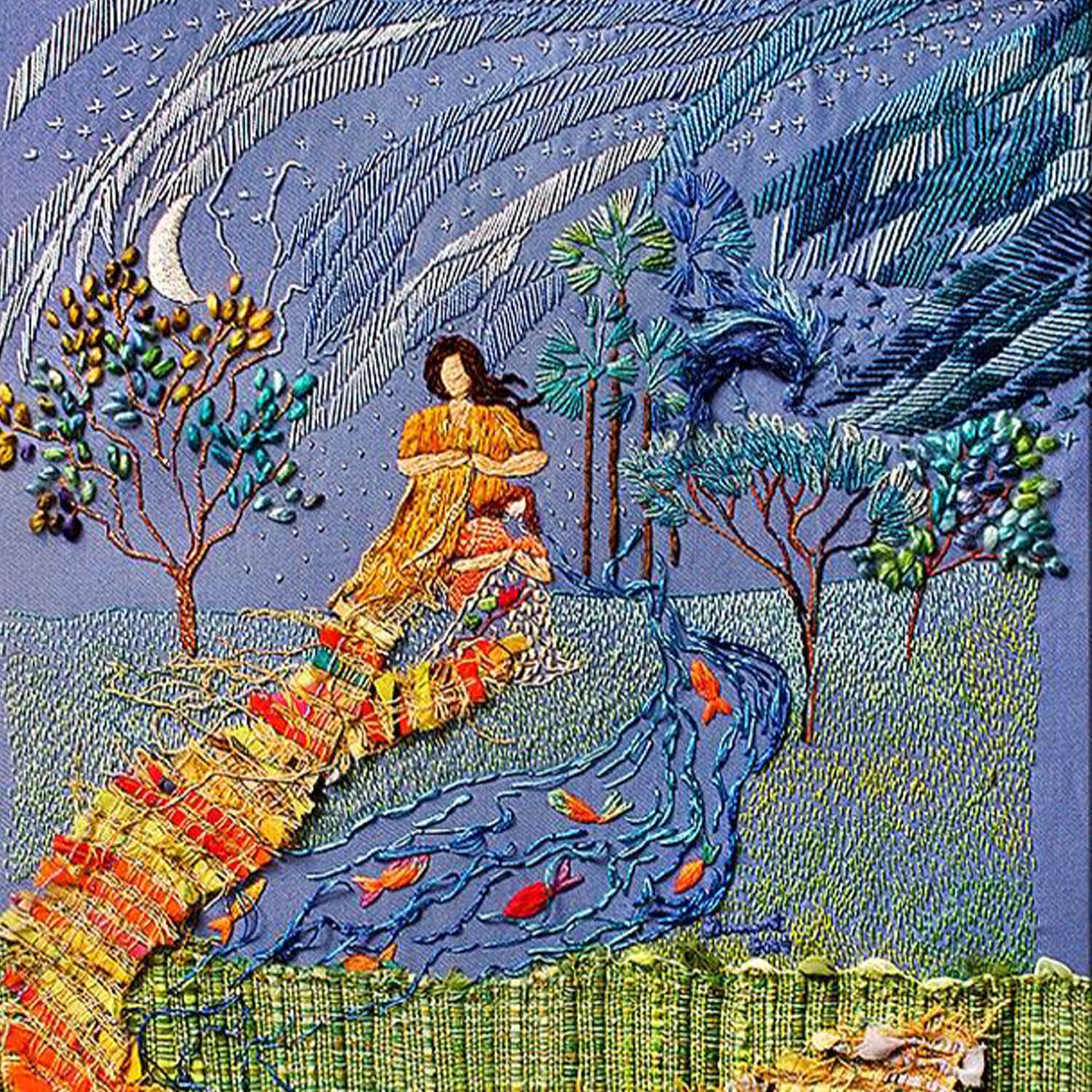 Bordado sobre tecelagem artesanal da Paraíba e sobre recortes de delicados azuis da tecelagem de Mercedes de Pirenópolis-GO. Foram utilizados fios de algodão, técnica bordado livre. Desenho Demóstenes Vargas.